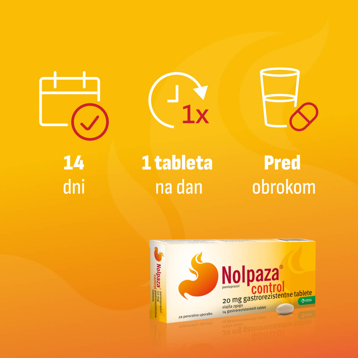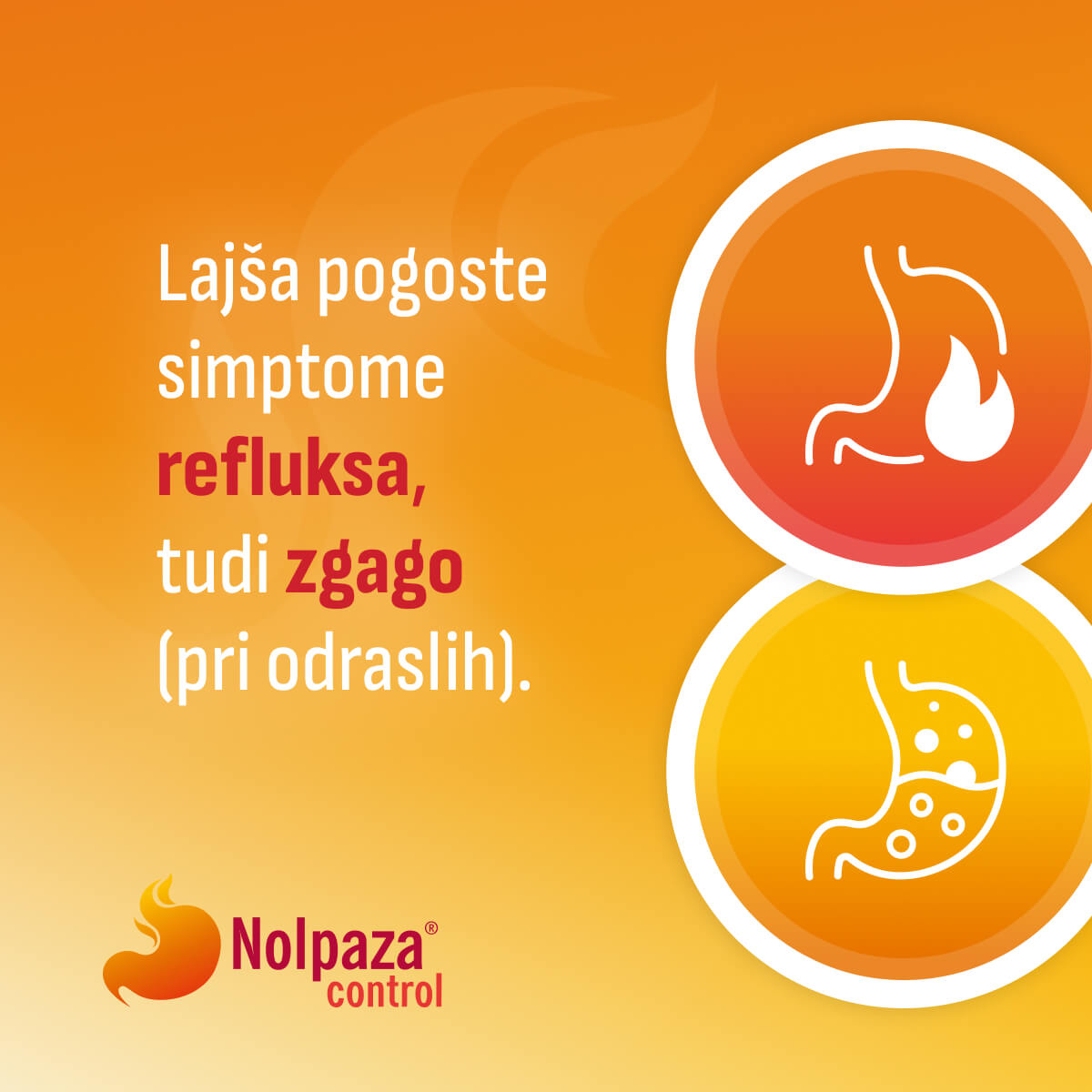 Nolpaza control je zdravilo za kratkotrajno zdravljenje simptomov refluksa (npr. zgage, regurgitacije kisline) pri odraslih. Vsebuje pantoprazol, ki spada v skupino zaviralcev protonske črpalke. Deluje tako, da zavira izločanje kisline v želodcu, in tako pomaga obvladovati simptome. Nolpaza control samo z 1 tableto na dan poskrbi za dolgotrajno olajšanje in pomaga izboljšati kakovost življenja.